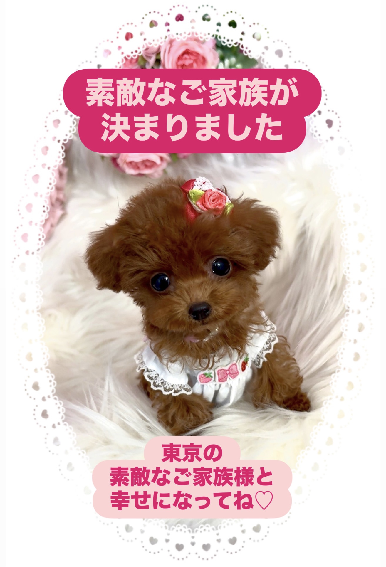 2026年最初のデビューを飾るのは 大きなクリクリおめめの 甘えんぼな性格の女の子 お鼻も短く赤ちゃんみたいなお顔が たまらなく可愛い子です(*^_^*) 生後3ヶ月過ぎとは思えないほど とっても小さな体で、手足も短く、 歩く姿も超〜可愛いんですよ ごはんもよく食べ元気いっぱい♪ 健康診断も合格しています! プレイルームで遊んでいる時も、 トイレシーツまで走って行って トイレができるようになってきて、 とってもおりこうさんなんですよ また、遊びの中で教えた《芸》は、 『お座り』『お手』『おかわり』『待て』が 可愛くできるようになりました♪ ぜひ見てあげて下さいませ(*^_^*) こんなお利口なこの子なら、 ワンちゃん初めてのかたにも 安心してオススメできます♪ どうぞ楽しんで育てて下さいませ (^.^)♡ 一度見たら忘れられない可愛さ。。。 世界中でこの子だけの特別な可愛さ。。。 こんないい子、なかなかいないかも 運命を感じたかたは、 ぜひ会いにいらしてください(*^_^*) | |||||